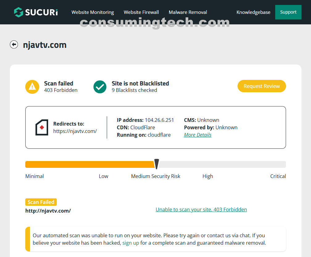 Our Sucuri scan failed on the njavtv.com homepage due to a 403 Forbidden status, meaning njavtv.com was likely choosing ot block security scans from running.