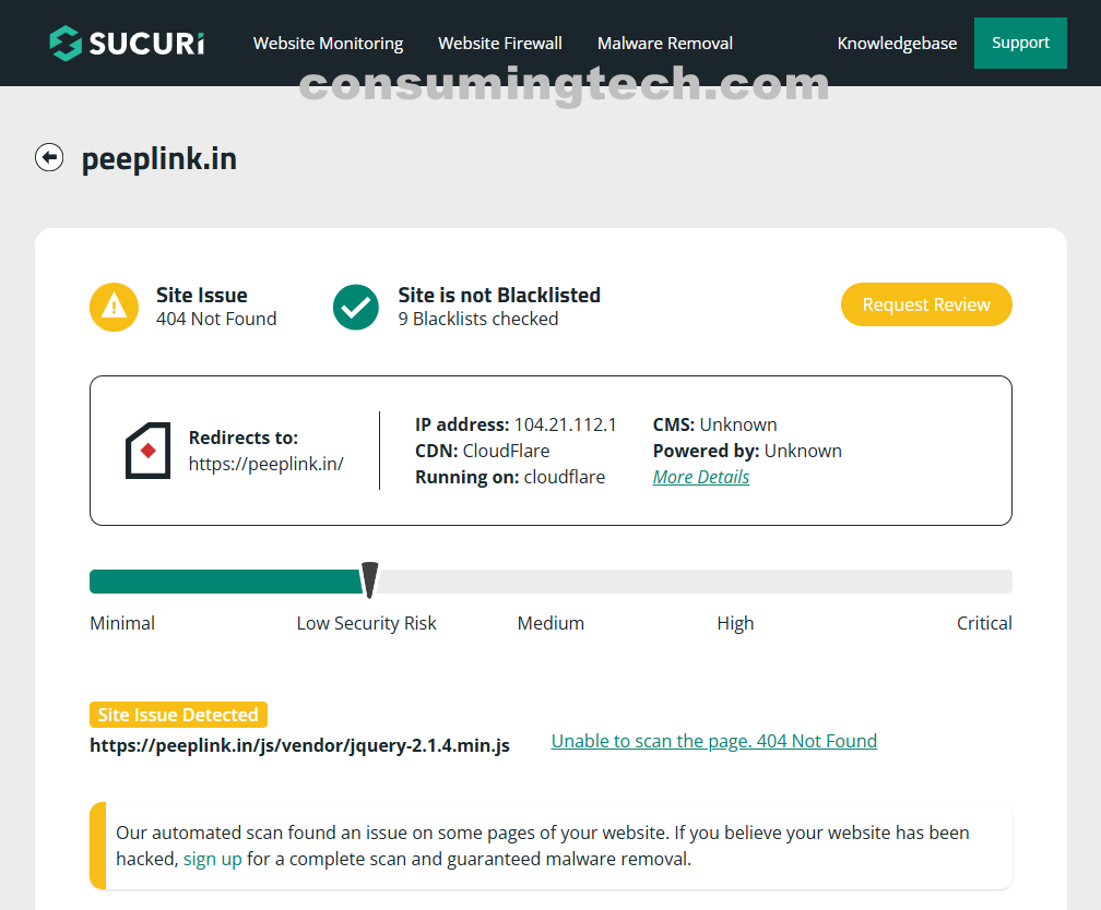 Our Sucuri scan showed a 404 Not Found status on https://peeplink.in/js/vendor/jquery-2.1.4.min.js. Since it’s only 1 URL, peeplink.in remains a low security risk overall.