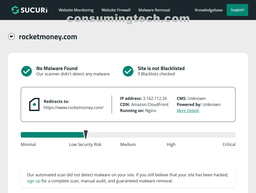 I checked rocketmoney.com on Sucuri, and it returned with no issues. (See screenshot.)