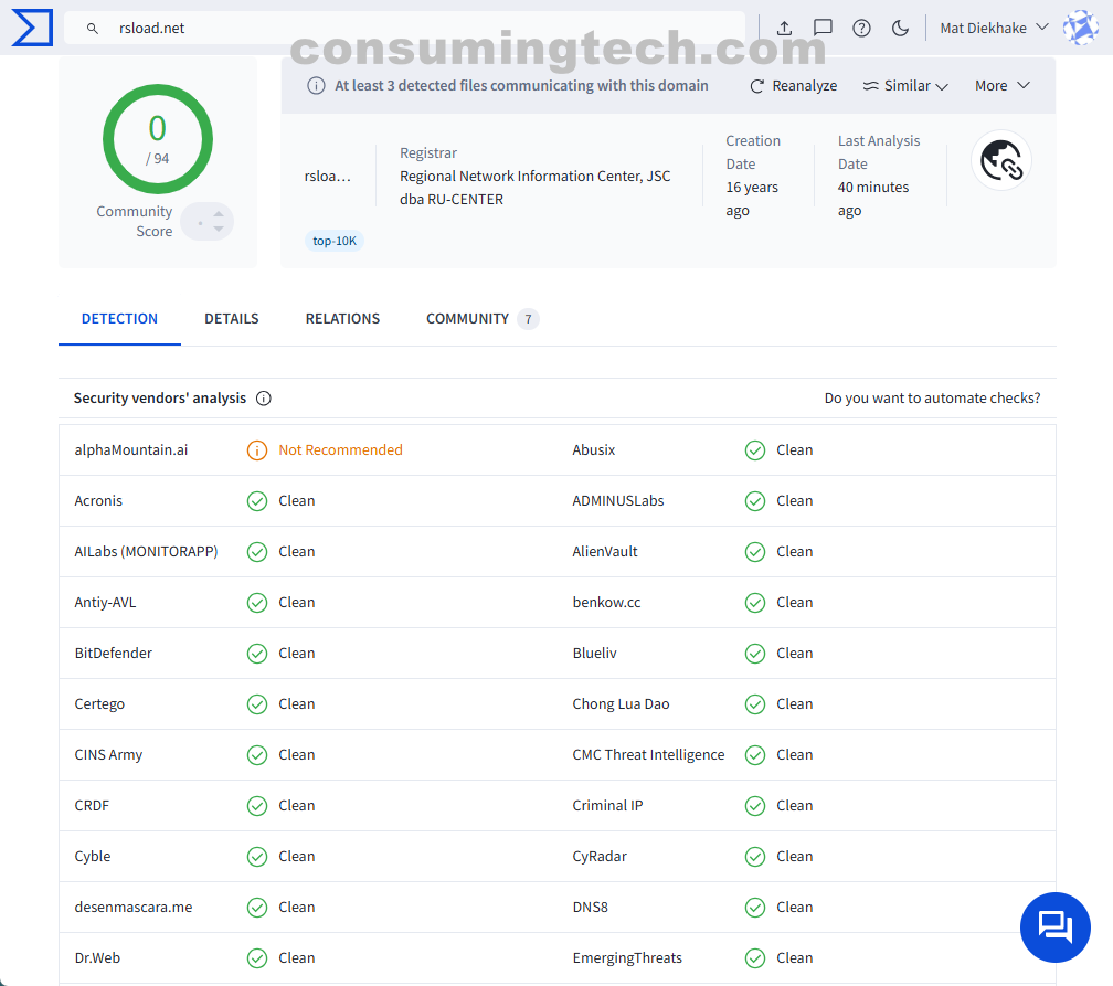 I also checked rsload.net on VirusTotal, and it is flagged as Not Recommended by alphaMountain.ai.