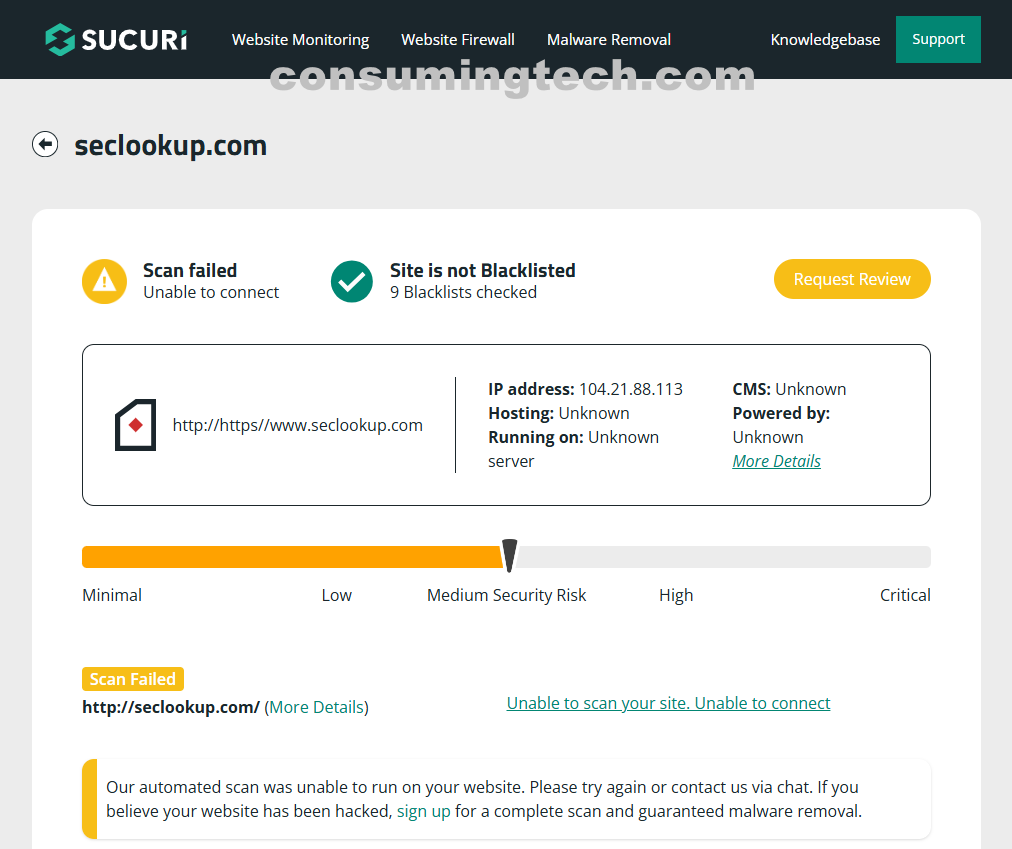 Our Sucuri scan returned an Unable to connect status on http://seclookup.com/.